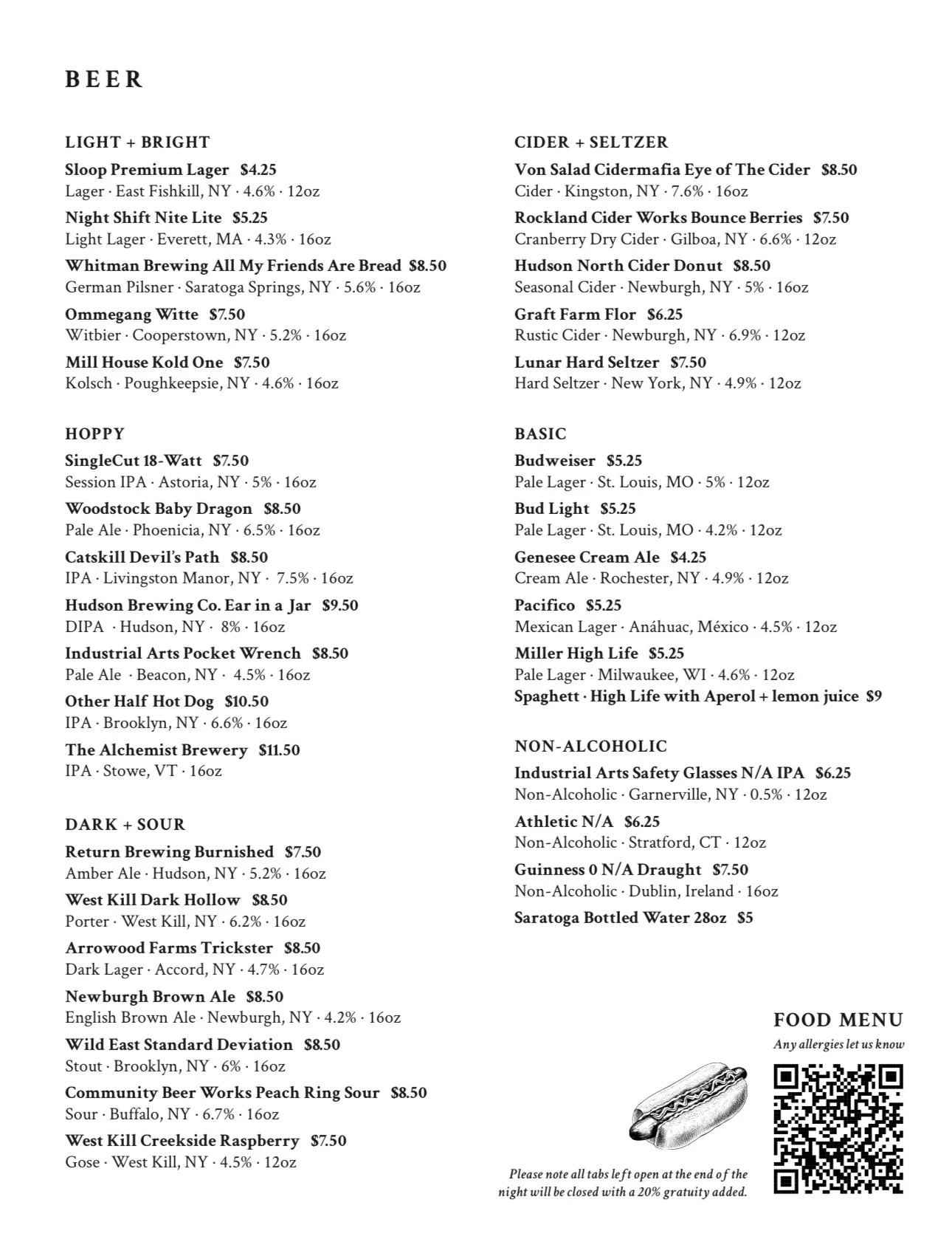 You can check out our full menu (including a full bottles & cans list, up to date draft list and food specials) here.